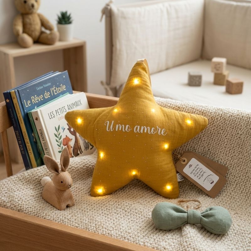 Cette veilleuse étoile est le cadeau de naissance idéal ou une déco parfaite pour une chambre d’enfant, alliant douceur, sécurité et personnalisation.