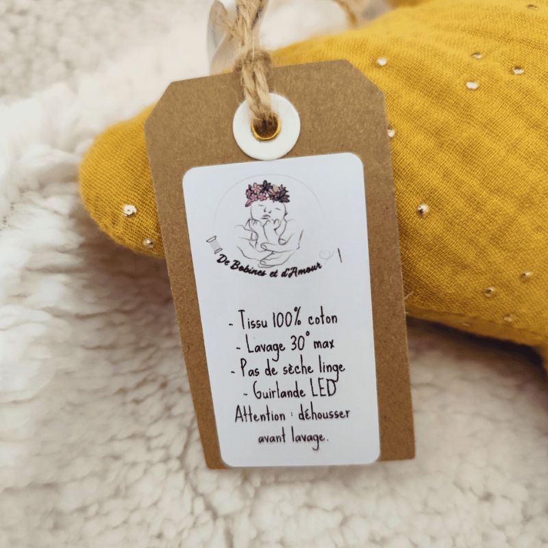 Cette veilleuse étoile en tissu double gaze est une création artisanale pensée pour le bien-être et la sérénité des tout-petits. Sa lumière tamisée crée une ambiance apaisante, parfaite pour rassurer bébé au moment du coucher.